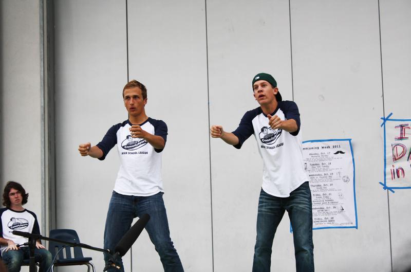 Besides watching players wear smelly trash cans, another highlight of the show was the game “Mega Replay.” Every time the referee shouted reverse or forward, the performers were forced to do the same scene over again. For this game, Rowe kissed senior Mitchell Chivetta on the cheek, repeatedly, while pretending to be his overbearing mother. This proved to be very prudent of the players because nothing works better than bromance, to captivate an audience of high school students.